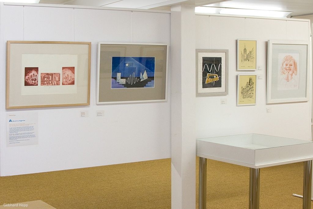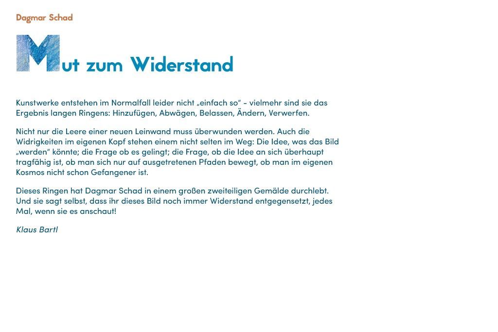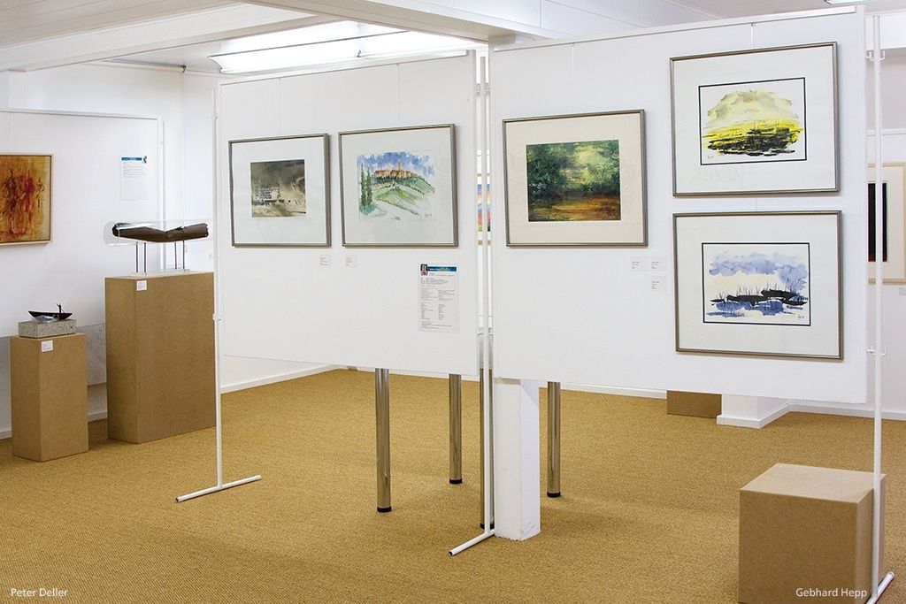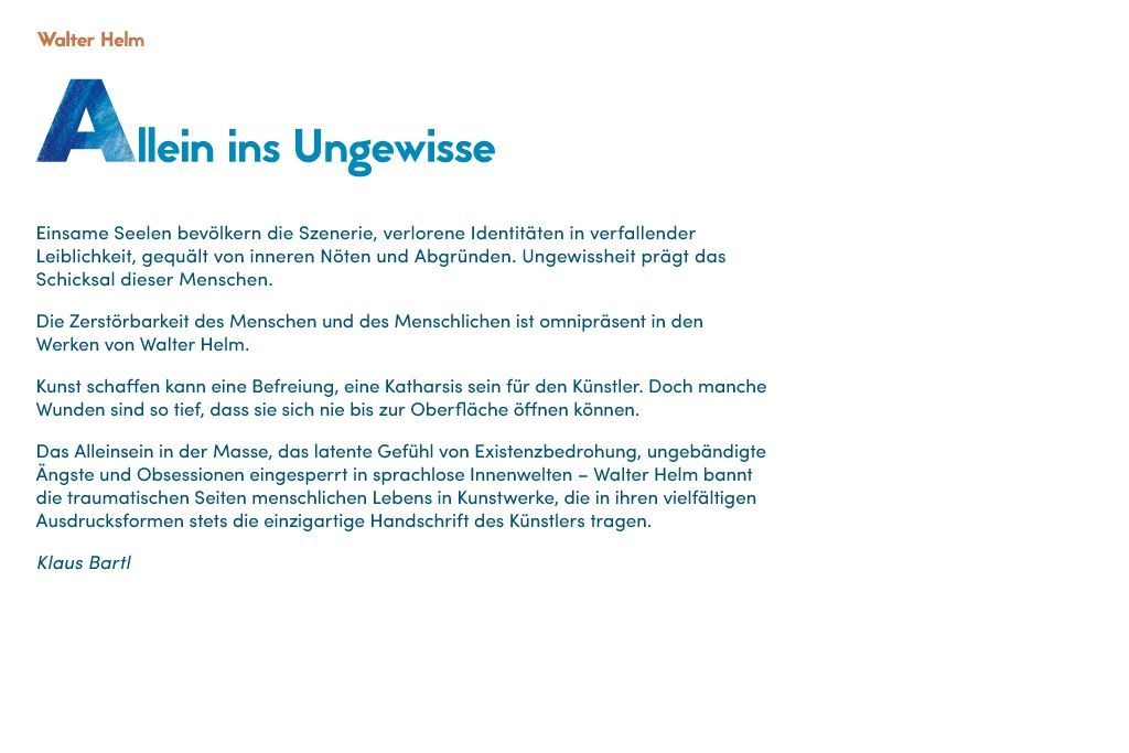 Mit Mut ins Ungewisse - Gemälde, Zeichnungen, Fotografie und Skulpturen von Klaus Bartl, Edelgard Bormann, Peter Deller, Walter Helm, Gebhard Hepp, Marga Parr, Dagmar Schad, Joachim Schmidt, Kerstin Schweitzer und Petra Wind.