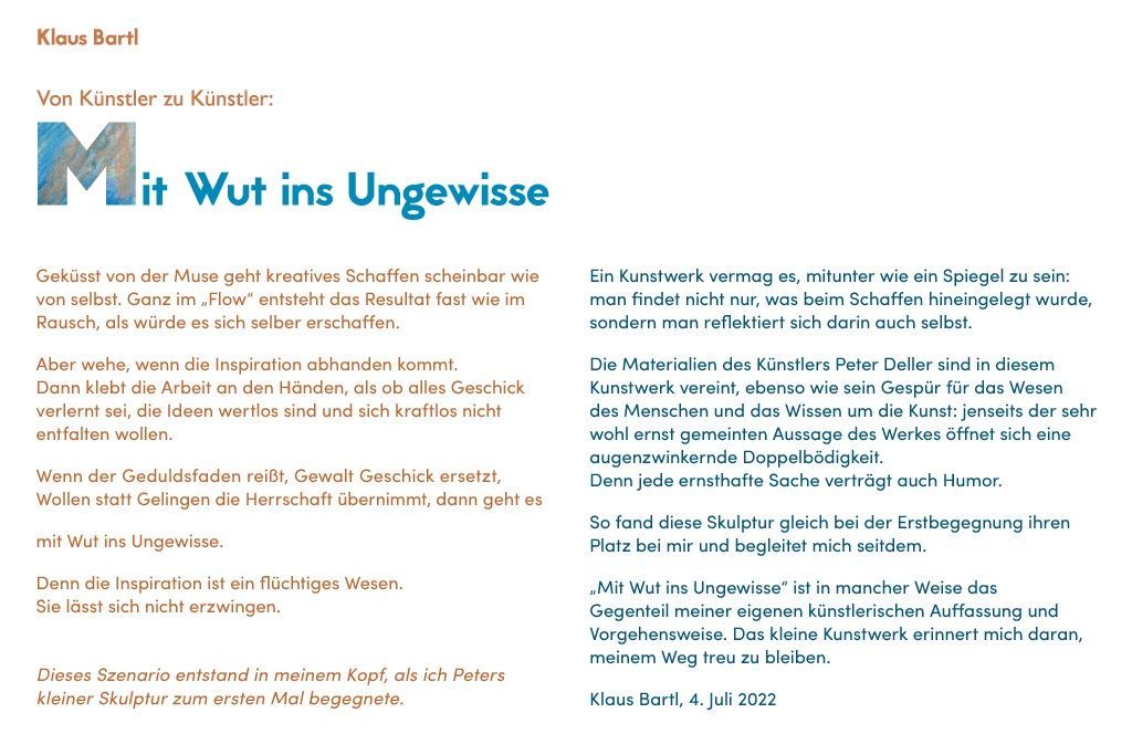 Zehn Künstlerinnen und Künstler des Kunstvereins präsentieren ihre persönliche Interpretation des Ausstellungskonzeptes "Mit Mut ins Ungewisse". Die Werke thematisieren gesellschaftskritische Gedanken, Sorge um unsere Welt, literarische Vorlagen, oder Überlegungen, die sich aus der unmittelbaren Beschäftigung mit dem Kunstschaffen ergeben.